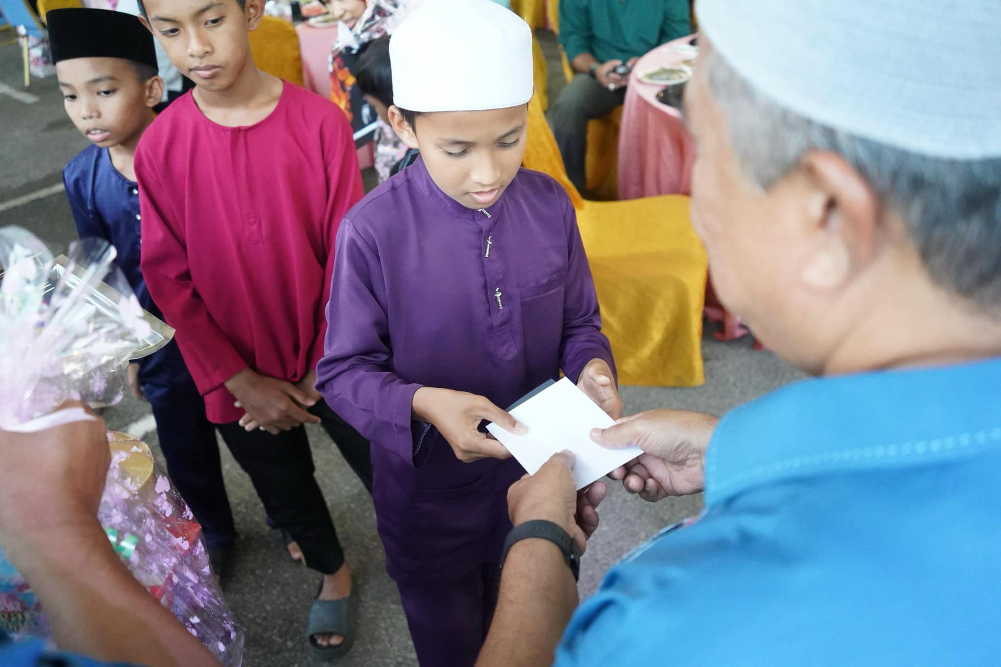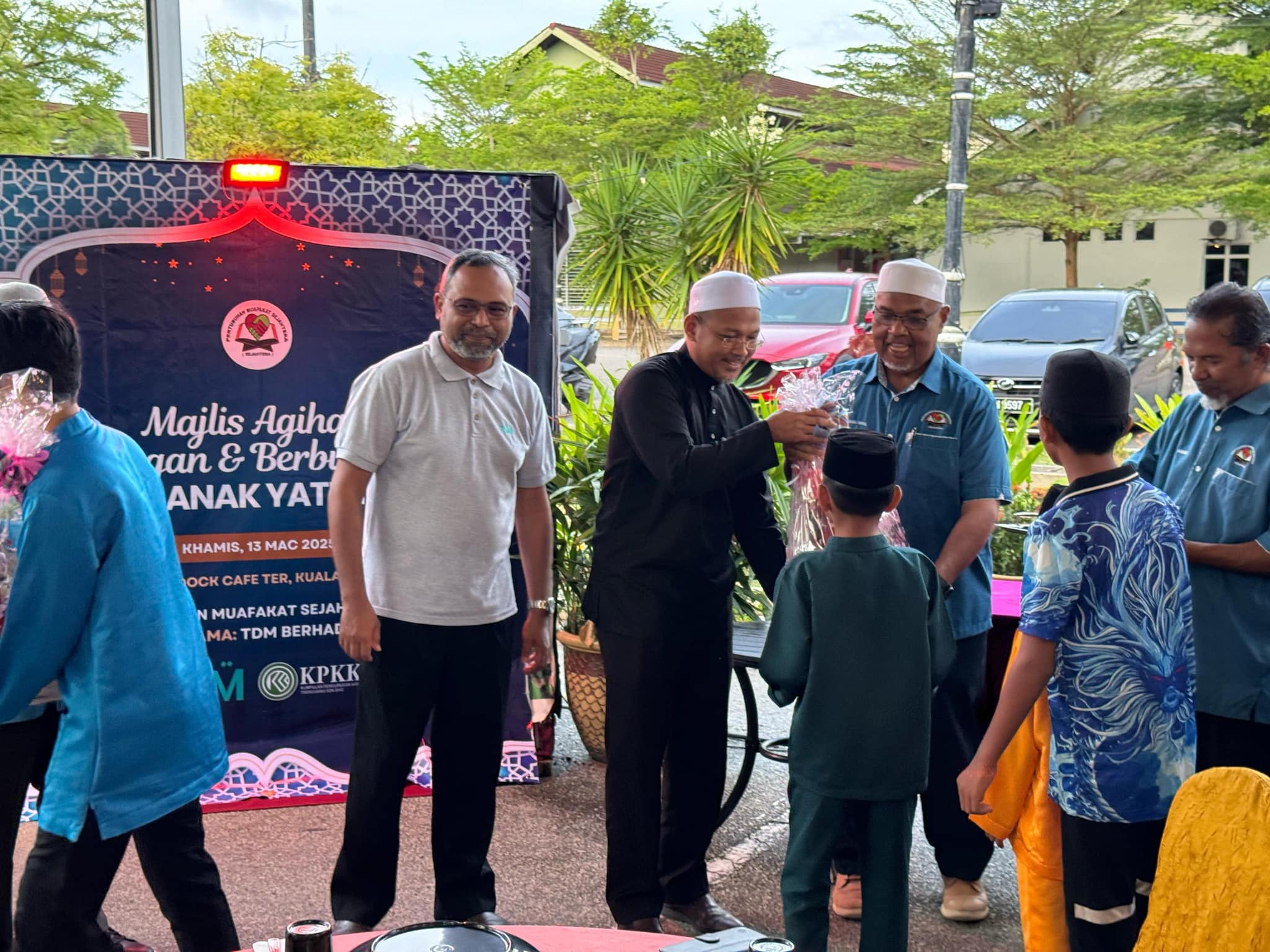Kumpulan Pengurusan Kayu Kayan Trengganu (KPKKT) participated in the Iftar with Orphans and Asnaf event held at Paddock Café, Terengganu Equestrian Resort. The program, organized by Pertubuhan Muafakat Sejahtera Terengganu, celebrated and brought joy to 40 orphans and asnaf from the constituencies of Rhu Rendang, Buluh Gading, Manir, and Pengkalan Berangan. The children received duit raya and festive hampers, personally handed over by Mr. Mohd Roslan bin Mamat, Chief Executive Officer of Golden Pharos Berhad. The event was further graced by the presence of YBhg. Dato’ Yahaya bin Ali, Chairman of Muafakat Sejahtera Terengganu and Golden Pharos Berhad, along with Mr. Ahmad Bazli Razali, Deputy General Manager of KPKKT.