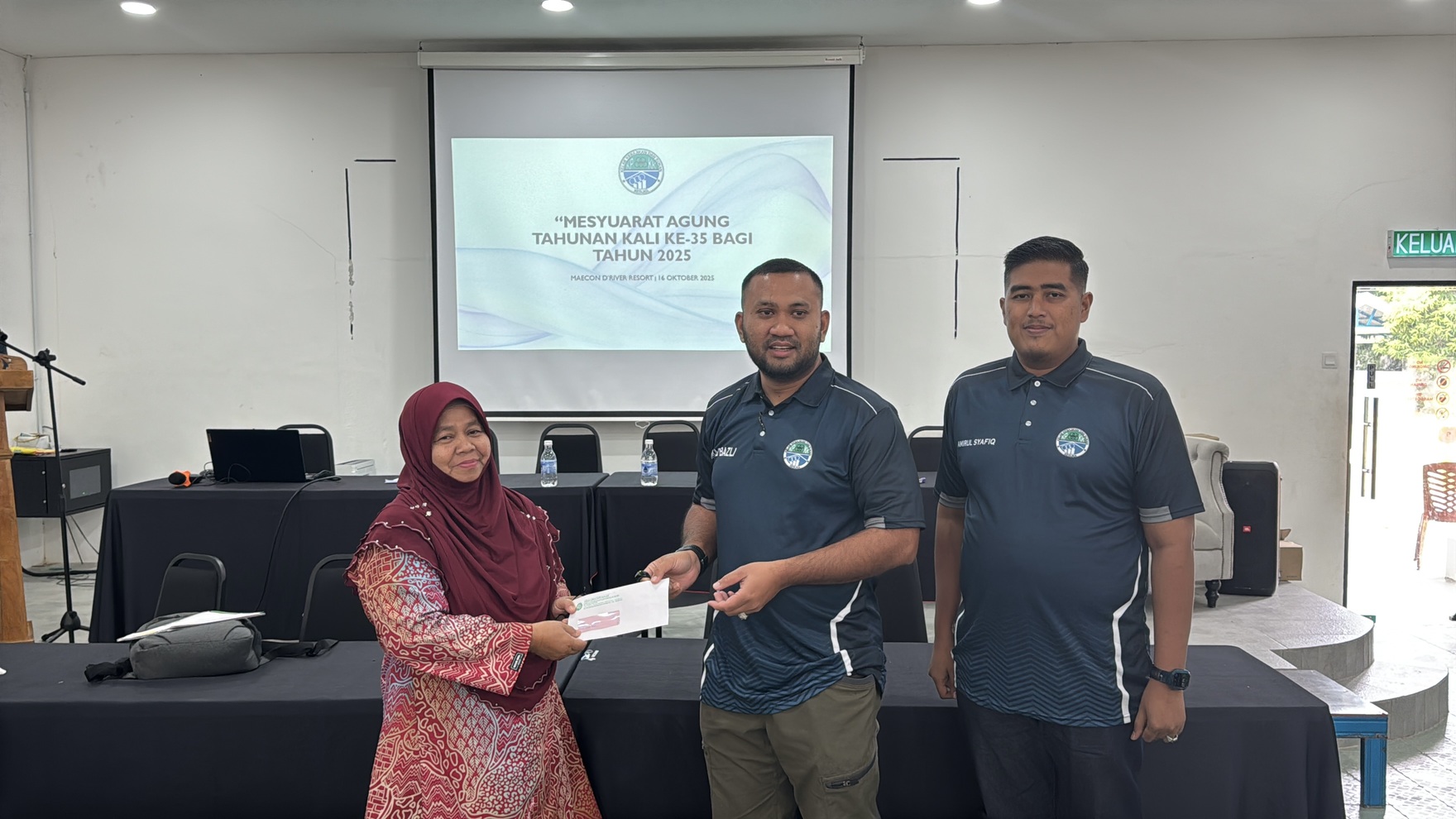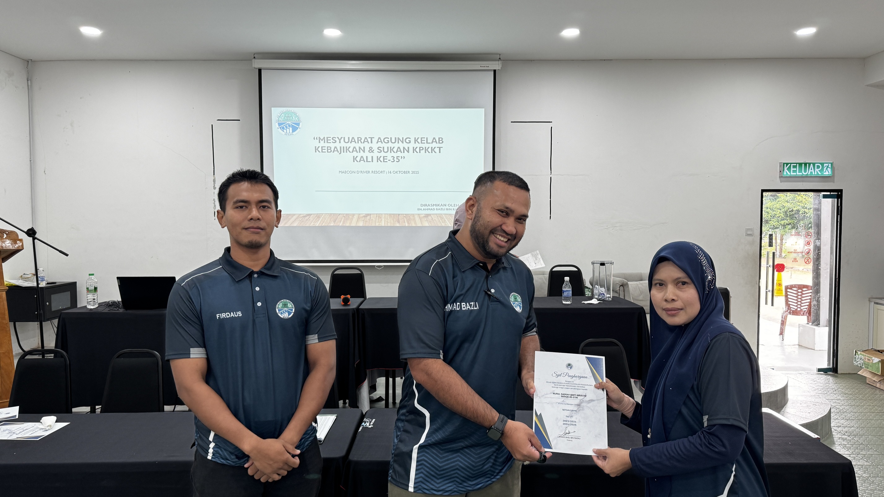 Kelab Sukan and Kebajikan KPKKT (KESUKA) held its 35th Annual General Meeting at Dewan Cempaka, Maecon D’River Resort, Kampung Beladau Selat, Kuala Terengganu. The program began at 8.00 a.m. with member registration and breakfast, followed by a prayer recitation by En. Faris bin Md. Fauzi and welcoming remarks by the Club Chairman, En. Amirul Syafiq bin Che Ajizi.