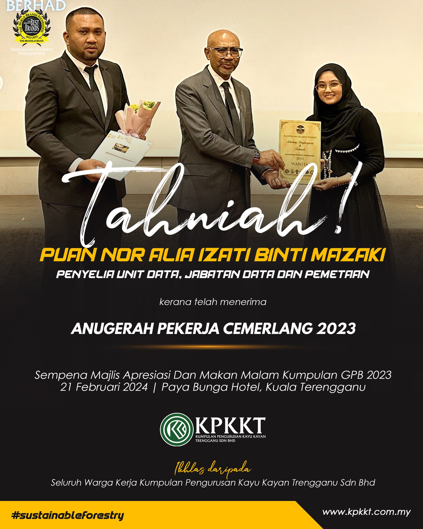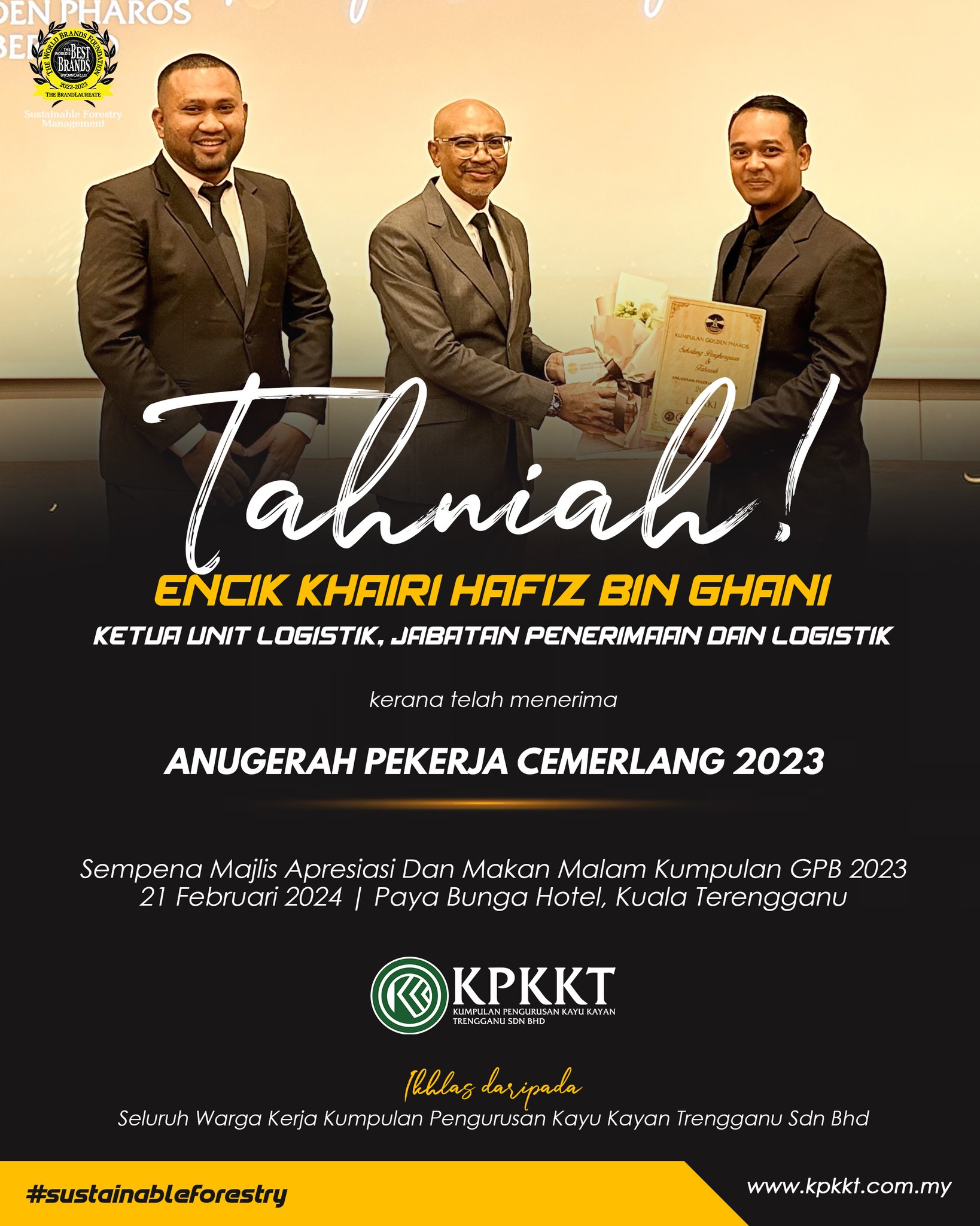 Tahniah diucapkan kepada warga KPKKT yang telah menerima anugerah pada Majlis Apresiasi dan Makan Malam Kumpulan Golden Pharos Berhad 2023 pada 21 Februari 2024 bertempat di Paya Bunga Hotel Terengganu.