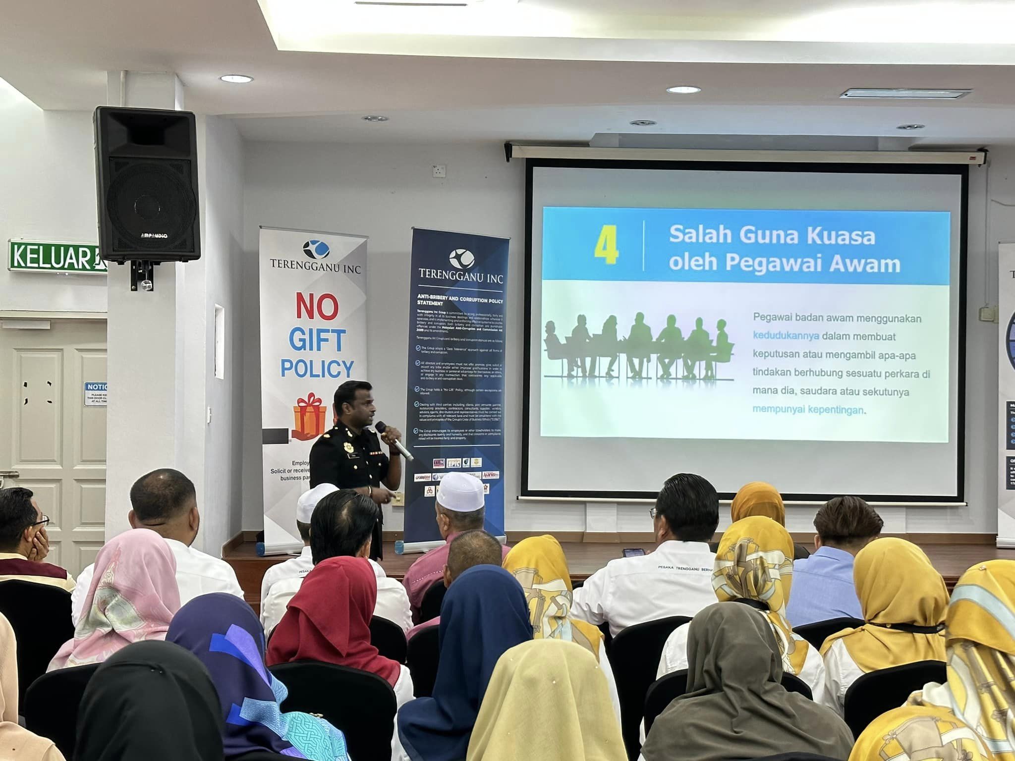 An integrity talk was delivered by Thinagaren a/l Vejian, Head of the Inspection & Consultation Unit, MACC Terengganu, providing exposure and explanation related to corruption misconduct in the company.